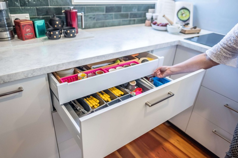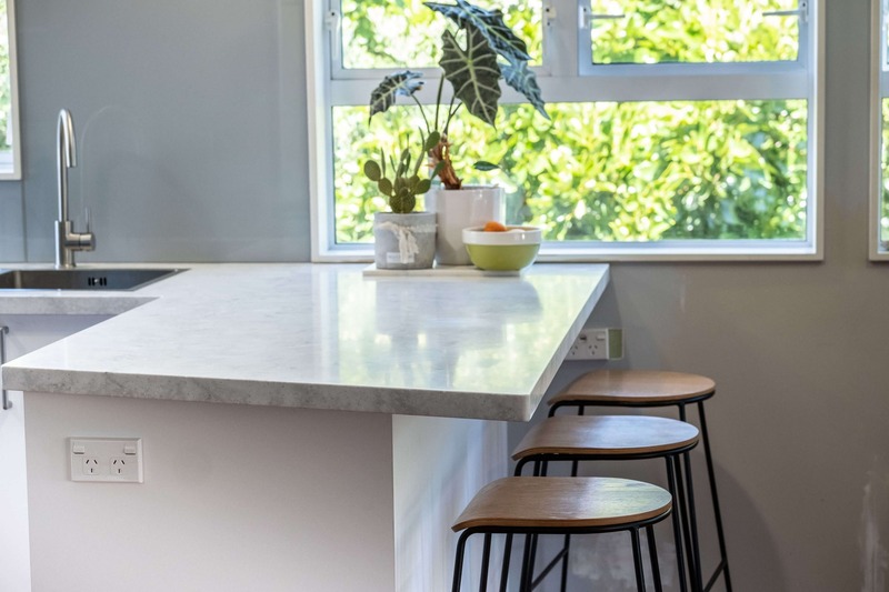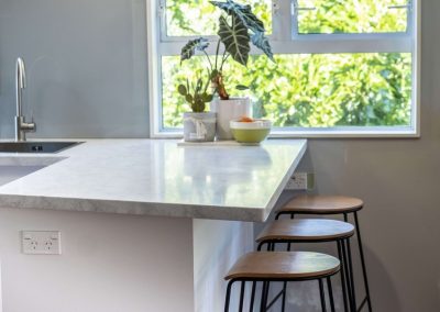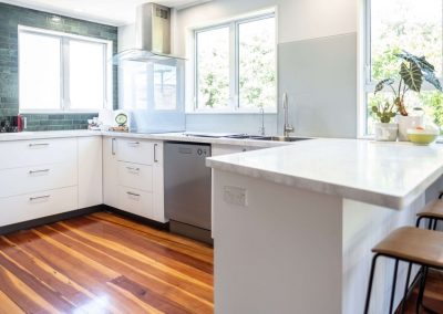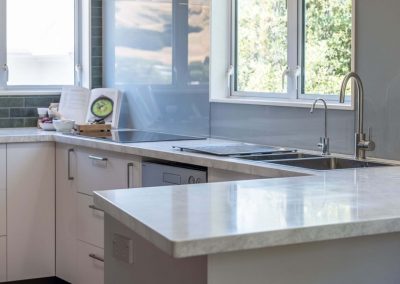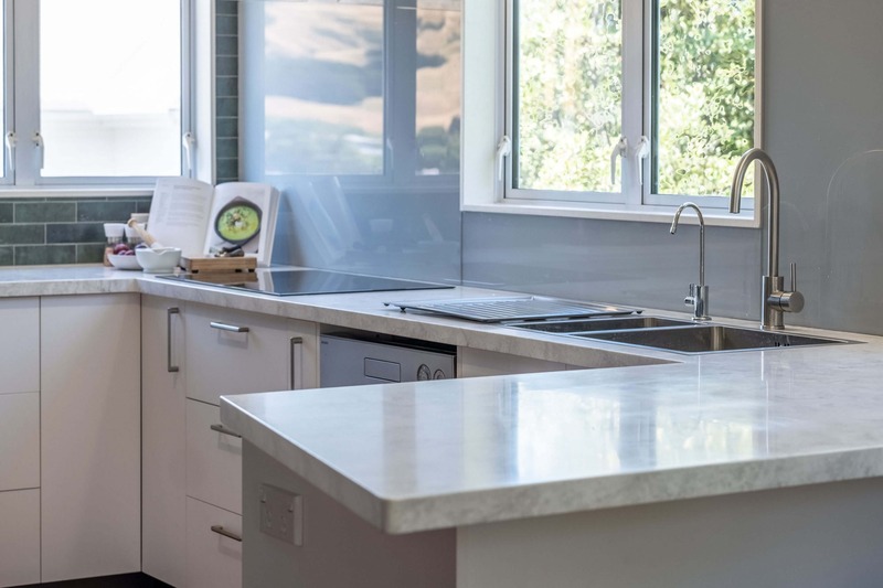 We used Laminex Hi Macs acrylic benchtops, not only for the stunning finish, but because it could be carried upstairs in several pieces and then joined seamlessly on site. The finished benchtop looks like one single piece and the clients absolutely love it!.