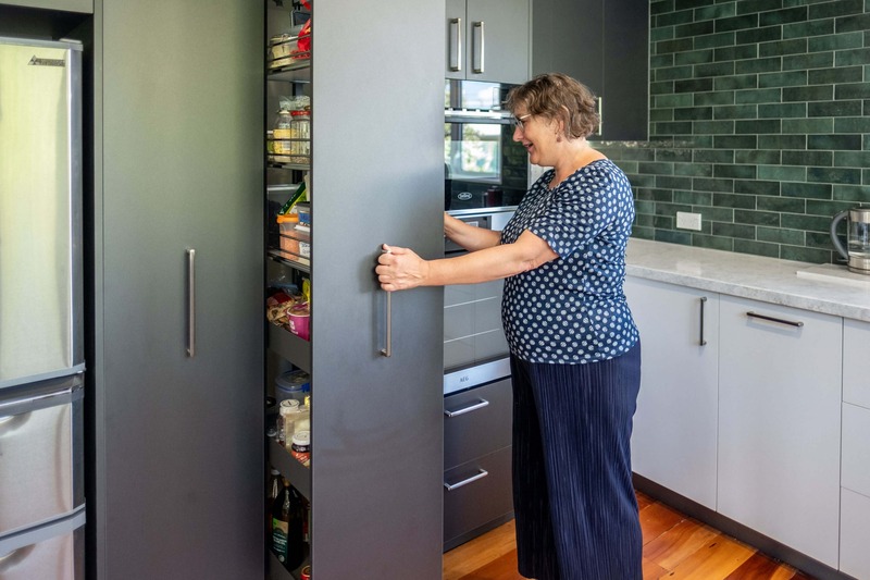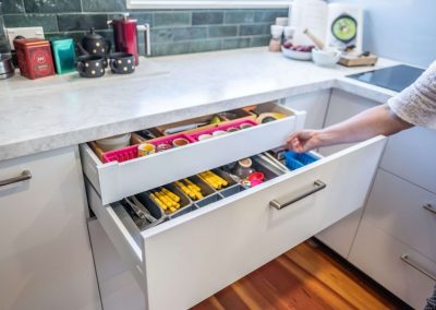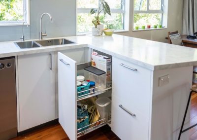 There are plenty of accessories to make the kitchen as functional as possible. You will notice 4 rubbish bins, pull out pantries, under bench pull out baskets, and oil and condiment storage solutions.