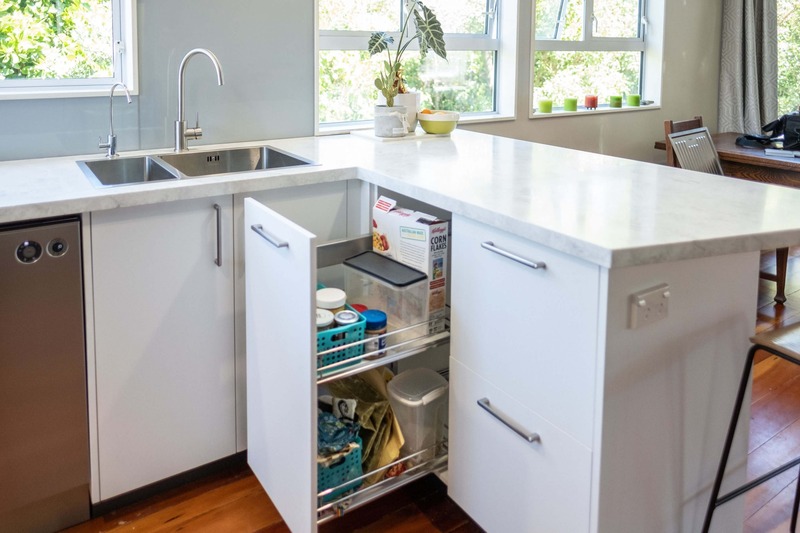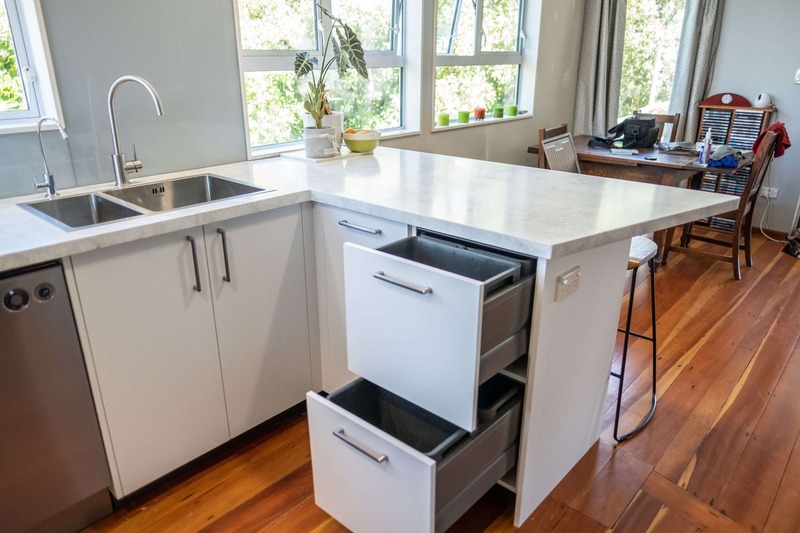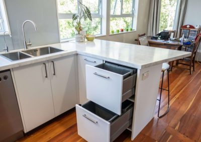 This kitchen was part of a major overhaul of a double storey home in Plimmerton. The kitchen is located upstairs with access only via a service lift or spiral staircase, so we had to make design decisions around this, and think about how we would get the finished cabinetry and benchtops into the house!