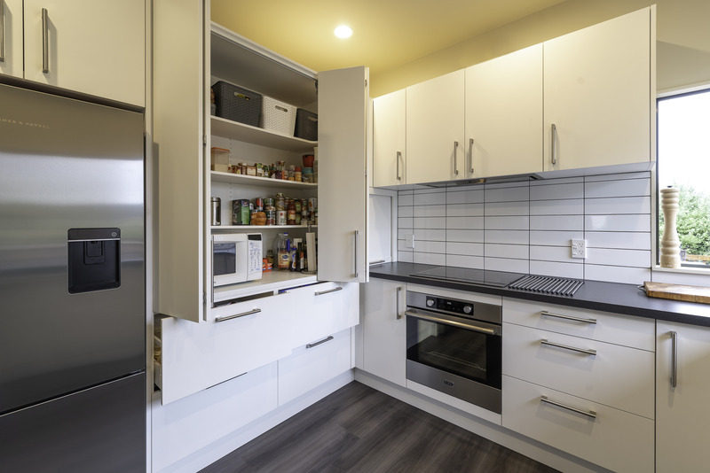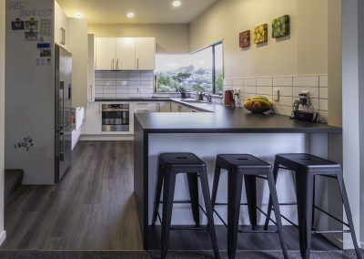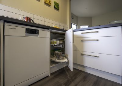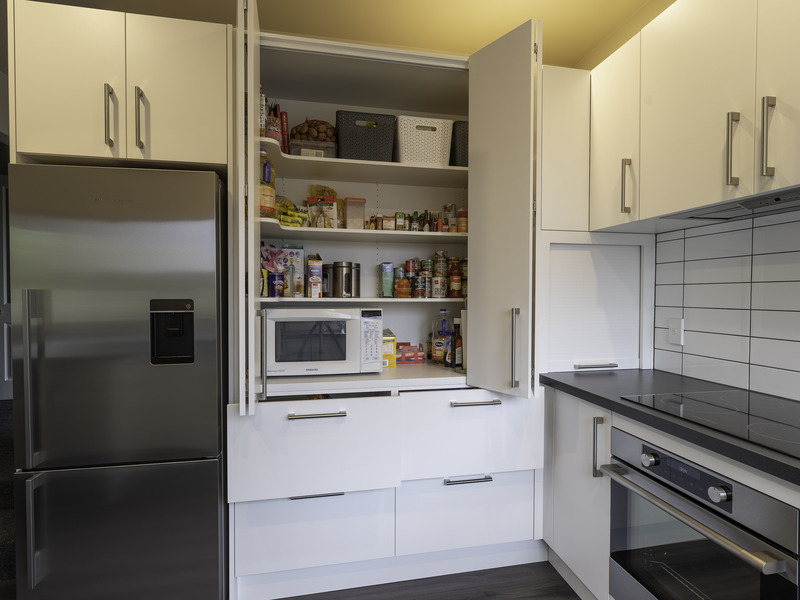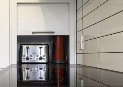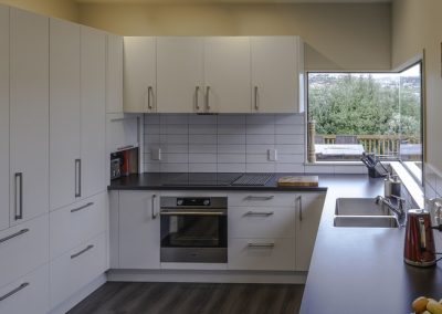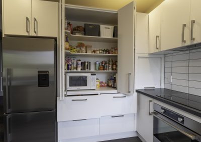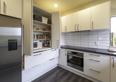 This fresh new kitchen makes the most of the space and natural light available. Incorporating a large functional pantry for the growing family, and re-positioning the sink & cook top made the layout and flow of the kitchen work much better. Featuring high pressure laminate benchtops with waterfall end and Sage Invisiedge doors & roller garage door to hide the small appliances.
